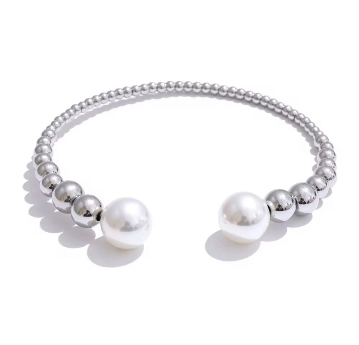 Silver beaded bracelet with pearls on a white background